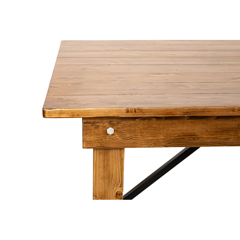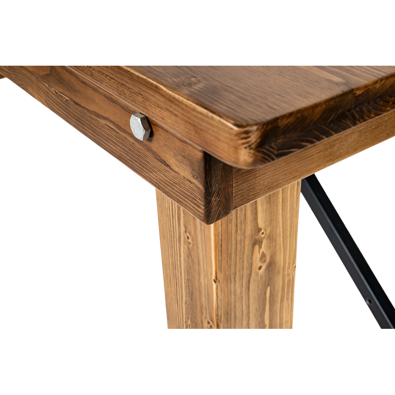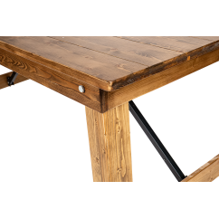 Přirozená struktura borovice podtrhuje jedinečné kouzlo stolu a vnáší do interiéru teplo a útulnost. Pečlivě propracované detaily a viditelná kresba dřeva mu dodávají autentický, venkovský vzhled. Kovové výztuhy zvyšují stabilitu konstrukce a zajišťují bezpečné používání i během velkých oslav.