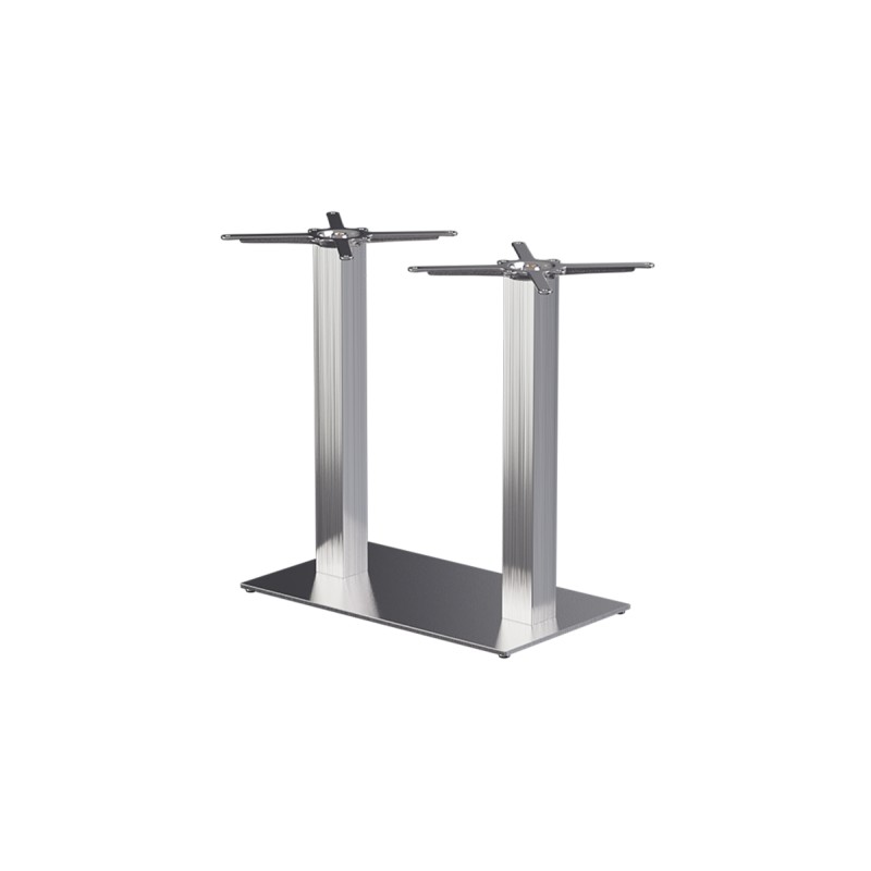 Konstrukce stolku je postavena na dvou sloupech z nerezové oceli o profilu 8x8 cm, které zajišťují rovnoměrnou oporu a vysokou odolnost proti zatížení. Podlouhlá základna s litinovým jádrem se stará o stabilitu i v dynamickém kavárenském provozu. Hmotnost je rozložena rovnoměrně, což eliminuje kývání i posouvání stolku. Celek působí elegantně a profesionálně a dobře zapadá do moderního minimalistického stylu.