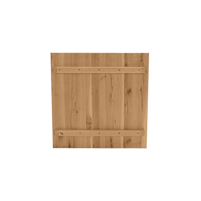 Barva desky je tmavá, teplá a hluboká, což podtrhuje ušlechtilost dřeva. Každý kus je jedinečný – liší se kresbou letokruhů, odstínem i uspořádáním přirozených detailů. Nejde o vady, ale o vlastnosti, které vytvářejí originalitu a autenticitu dřeva. Zespodu je použit systém speciálních výztuh, který snižuje riziko tzv. „prohýbání“ desky. Masivní dubové dřevo lze opakovaně obnovovat broušením, kdykoli je potřeba vrátit povrchu svěží vzhled.