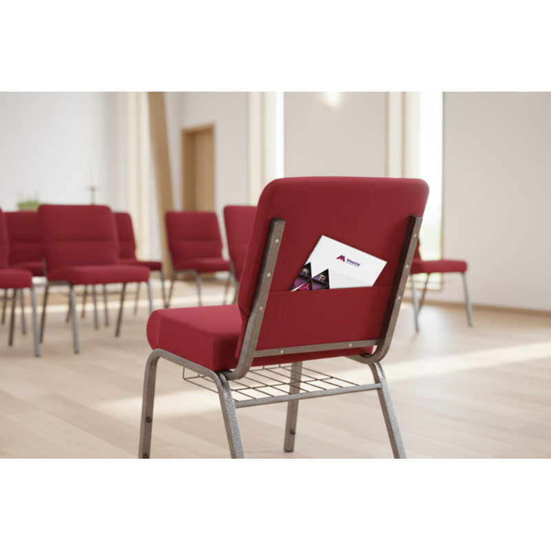 Sedadlo kostelní židle Mextra AMBASSADOR bylo navrženo s ohledem na dlouhodobé pohodlí. Silná a velmi komfortní pěna T30 o hustotě 30 kg/m³ poskytuje stabilní oporu a snižuje únavu během bohoslužeb, adorací nebo formačních setkání. Vysoká odolnost čalounění proti oděru (≥30 000 cyklů) zaručuje dlouhou životnost i při intenzivním používání. Na zadní straně opěradla se nachází praktická kapsa, do které lze uložit letáky, zpěvníky nebo informační materiály.