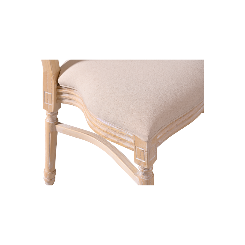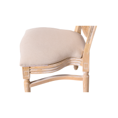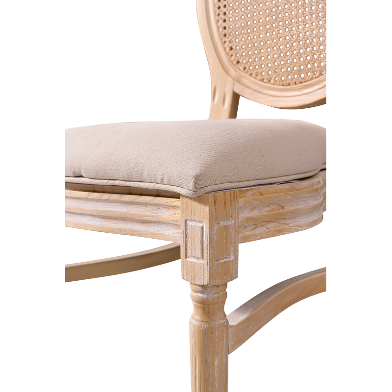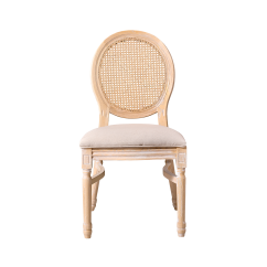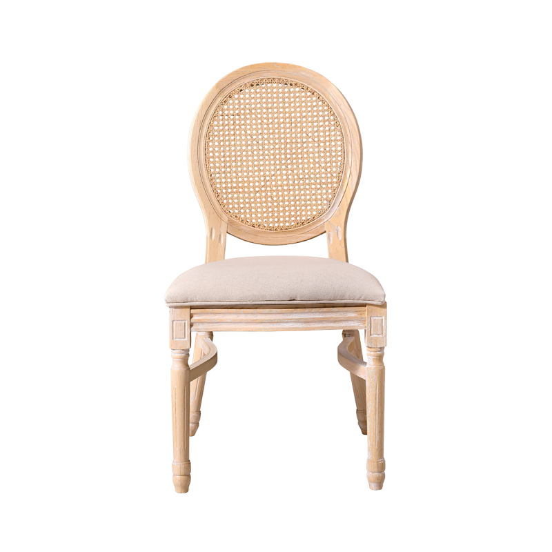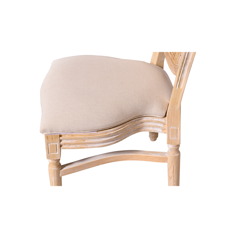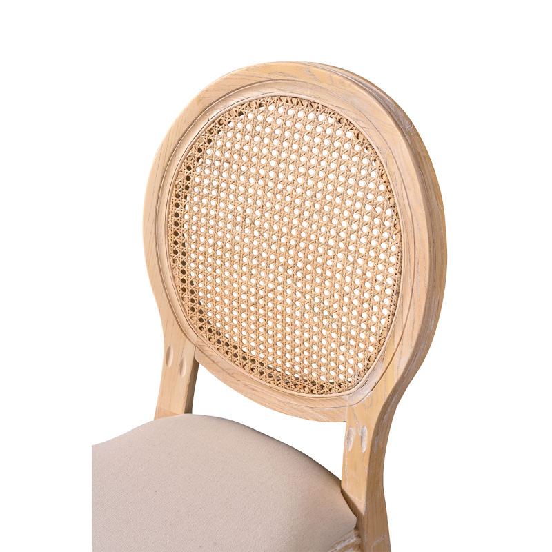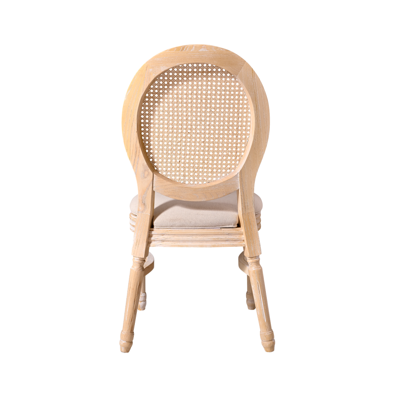 Vyrobena z masivního dřeva, židle poskytuje stabilitu a odolnost nezbytnou pro intenzivní používání v komerčních prostorách. Ratanové opěradlo jemně narušuje klasickou formu, čímž jí dodává lehkost a jemnost. Čalouněné sedadlo zaručuje pohodlí i při dlouhých slavnostech a recepcích.