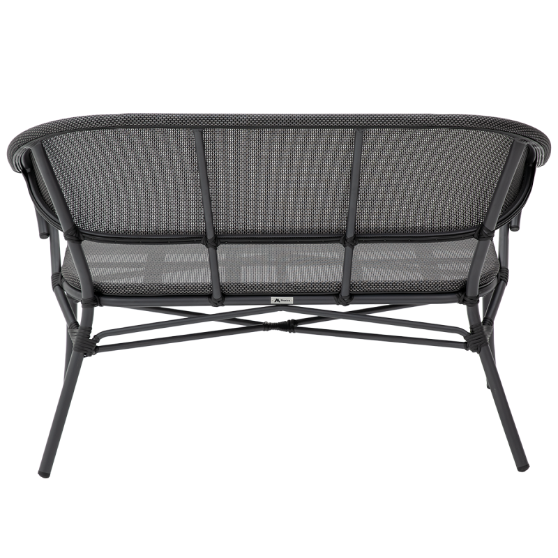 Sedák i opěradlo jsou vyrobeny z technorattanové síťoviny s rovnoměrným napnutím, která zajišťuje stabilní oporu při používání. Jemná struktura výpletu zvyšuje komfort sezení a zároveň dodává lavici vizuální lehkost. Tato forma technorattanu se osvědčuje v intenzivně využívaných prostorách a dlouhodobě si zachovává svůj tvar i estetiku.